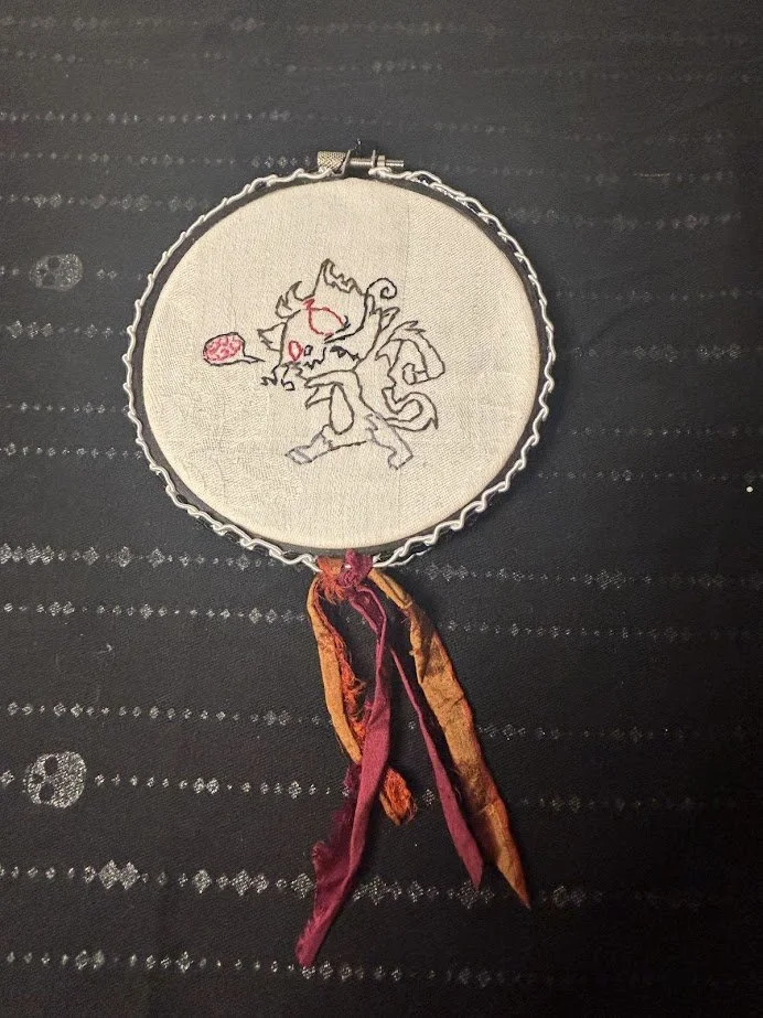 Each piece is embroidered by hand, not machine, and placed in a vintage frame or decorated wooden hoop.